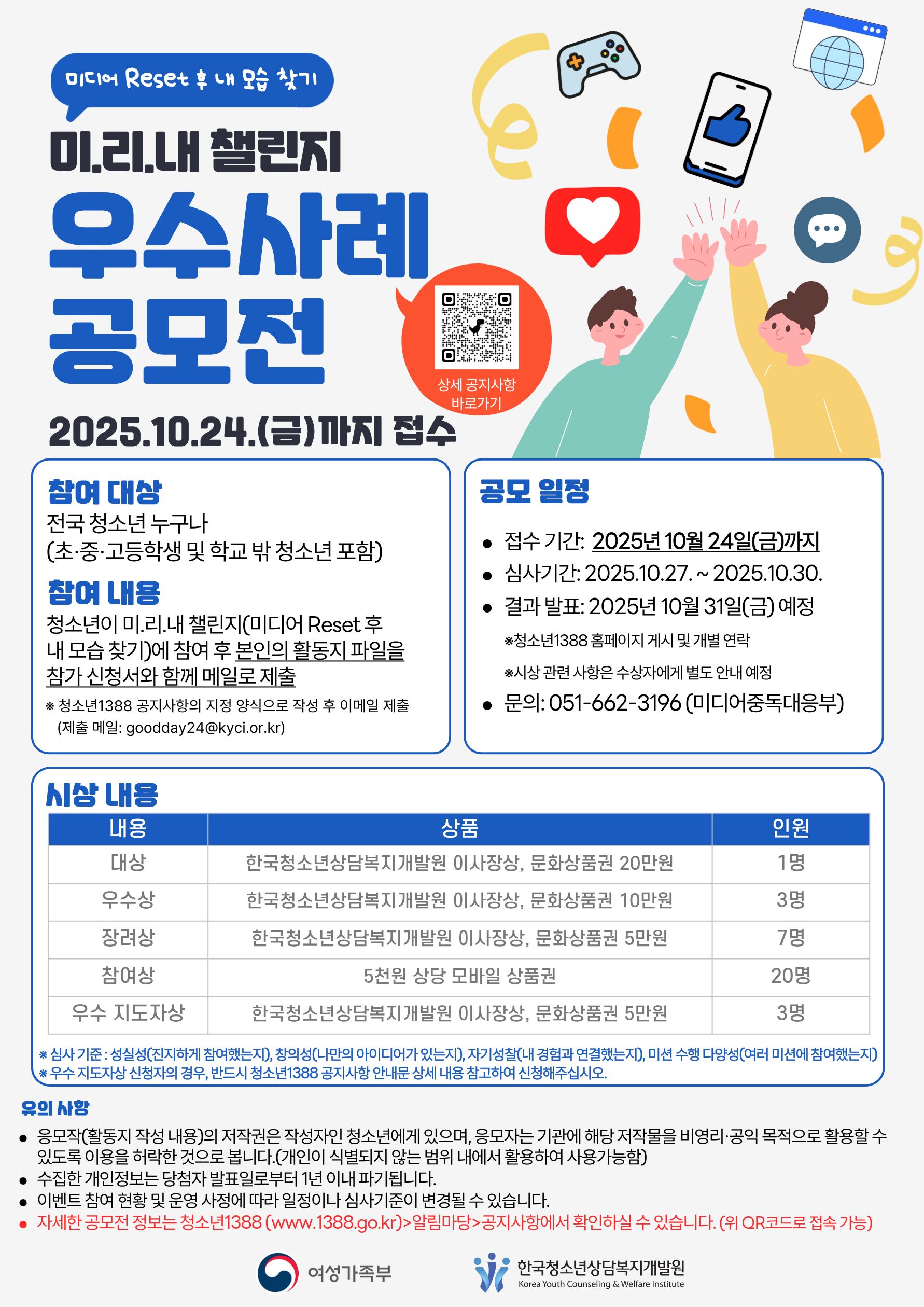 알림마당 공지사항 채용공고 카드뉴스 포토뉴스 보도자료 예산/결산자료 공지사항 알림마당 공지사항 [이벤트] 미.리.내.(미디어 리셋 후 내 모습 찾기) 챌린지 이벤트 개시 작성일 : 2025.09.25 14:06:18 조회 : 612 이전 게시물 보기 다음 게시물 보기 첨부파일 목록