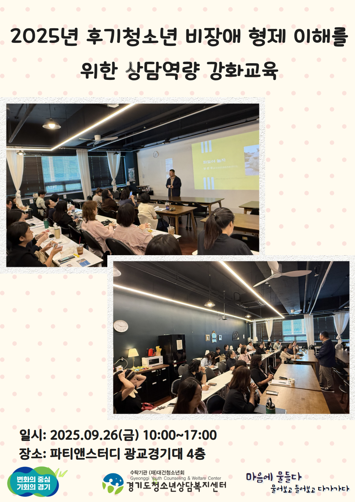 후기청소년 비장애 형제들이 겪는 심리와 정서적 어려움을 깊이 이해하고, 상담 현장에서 공감과 지지를 효과적으로 전달할 수 있는 방법을 함께 배우는 시간들을 가졌습니다.