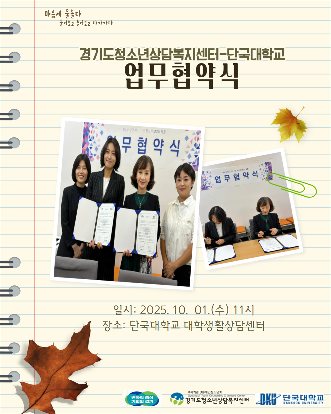 알림마당 공지사항 채용공고 카드뉴스 포토뉴스 보도자료 예산/결산자료 포토뉴스 알림마당 포토뉴스 업무협약 체결 (경기도청소년상담복지센터–단국대학교) 작성일 : 2025-10-02 15:31:22 조회 : 283 이전 게시물 보기 다음 게시물 보기 경기도청소년상담복지센터와 단국대학교 대학생활상담센터는 2025년 10월 1일(수), 상담사례 연계를 위한 업무협약(MOU)을 체결하였습니다. 양 기관은 청소년이 마음의 어려움을 극복하고 건강하게 성장할 수 있도록 긴밀히 협력해 나가겠습니다!! #업무협약 #후기청소년 #청소년상담 #마음건강 #경기도청소년상담복지센터 #단국대학교 첨부파일 목록