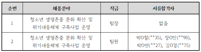 알림마당 공지사항 채용공고 카드뉴스 포토뉴스 보도자료 예산/결산자료 채용공고 알림마당 채용공고 주요 2026년 제1차 경기도청소년상담복지센터 신규직원 서류전형 합격자 발표 작성일 : 2026.01.30 15:45:43 조회 : 705 이전 게시물 보기 다음 게시물 보기 2026년 제1차 경기도청소년상담복지센터 신규직원 서류전형 합격자 발표 * 2026년 제1차 경기도청소년상담복지센터 신규직원 채용에 관심을 가지고 지원해 주신 모든 분께 감사드립니다. * 서류전형 합격자분은 개별 연락 드립니다. 첨부파일 목록