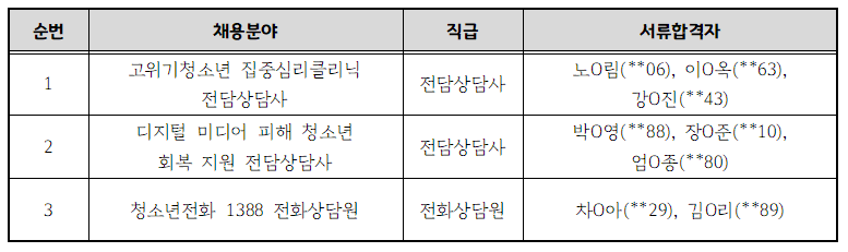 알림마당 공지사항 채용공고 카드뉴스 포토뉴스 보도자료 예산/결산자료 채용공고 알림마당 채용공고 주요 2026년 제2차 경기도청소년상담복지센터 신규직원 채용 서류전형 합격자 발표 작성일 : 2026.02.09 19:44:54 조회 : 727 이전 게시물 보기 다음 게시물 보기 2026년 제2차 경기도청소년상담복지센터 신규직원 채용 서류전형 합격자 발표 * 2026년 제2차 경기도청소년상담복지센터 신규직원 채용에 관심을 가지고 지원해 주신 모든 분께 감사드립니다. * 서류전형 합격자분은 개별 연락 드립니다. 첨부파일 목록
