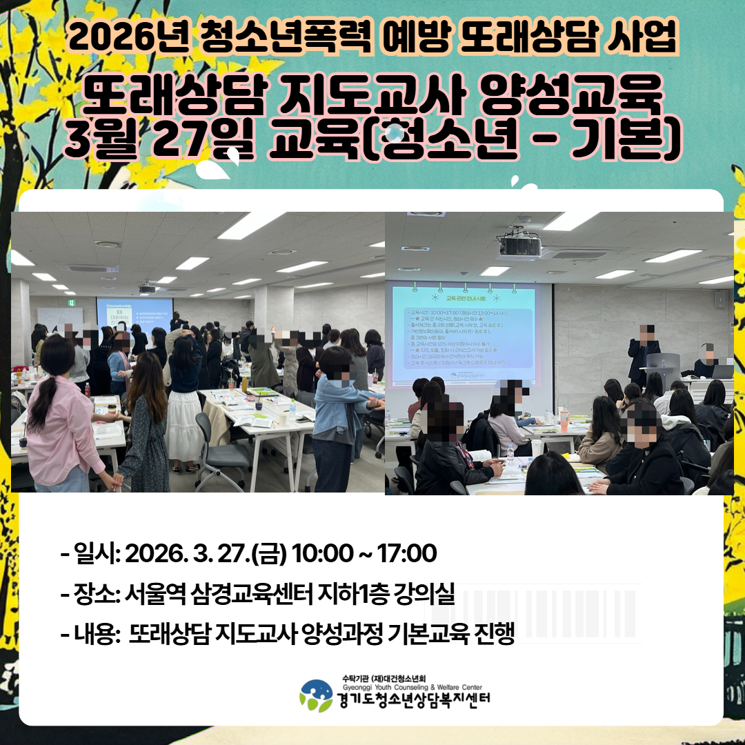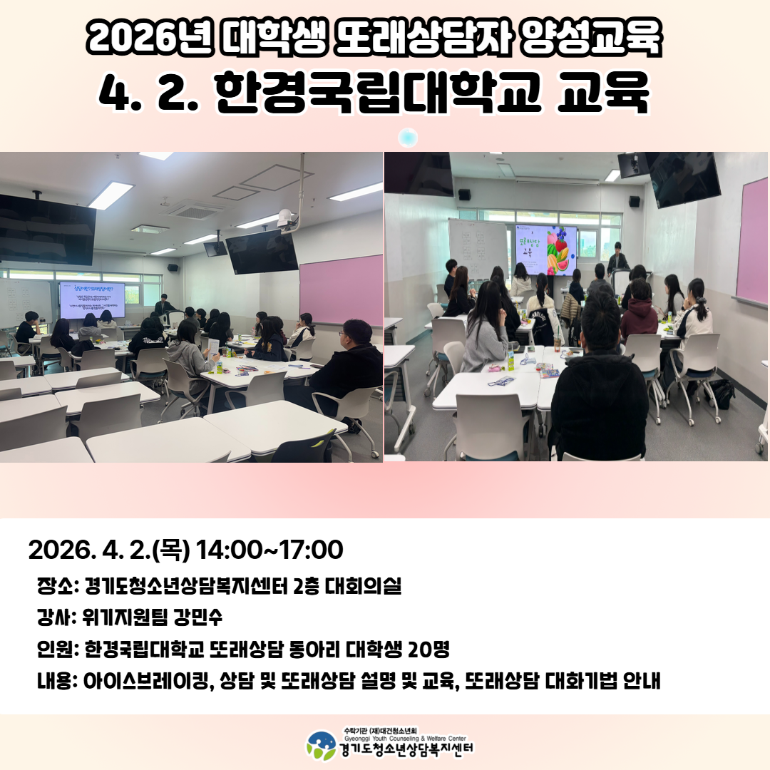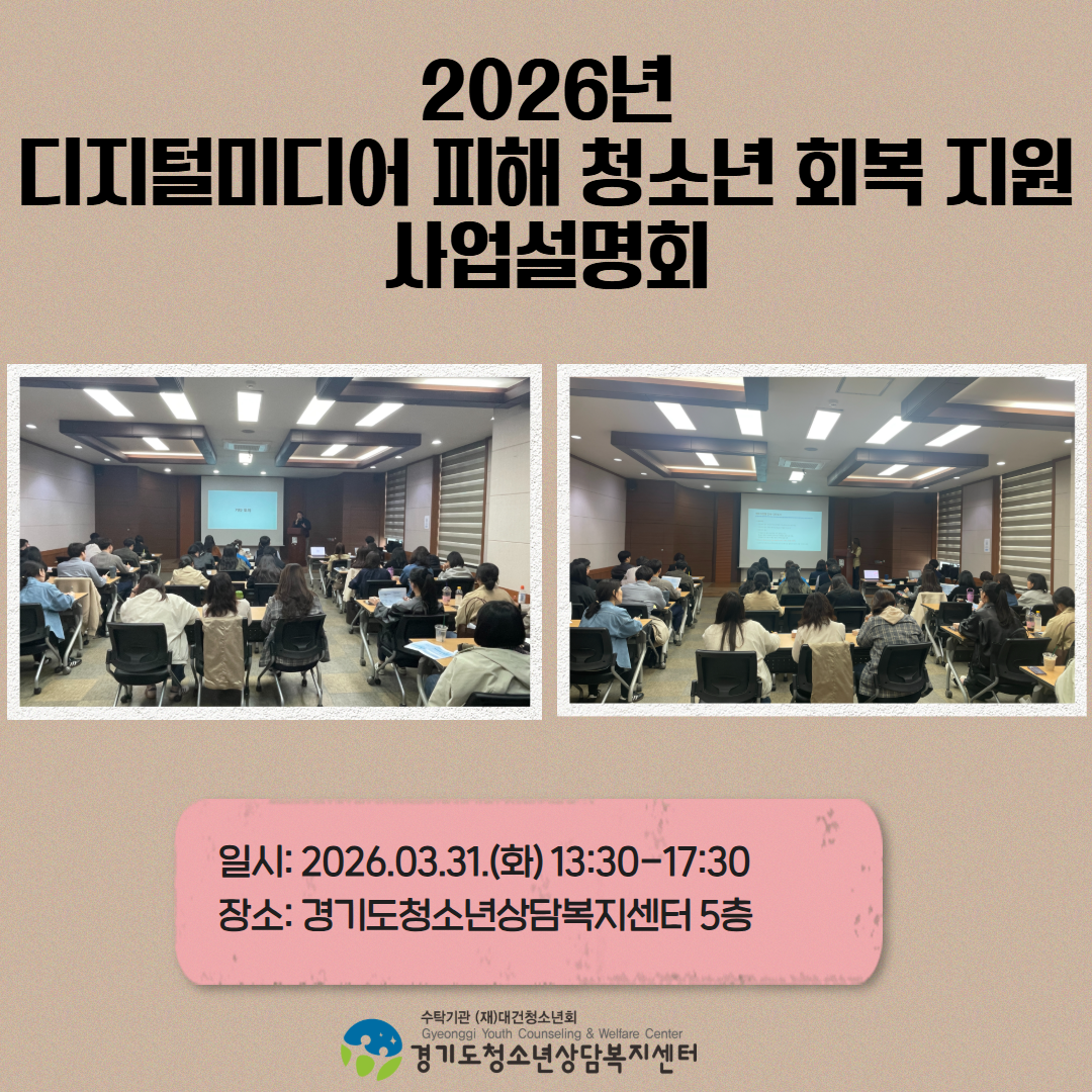 접수 : 2026.03.25 ~ 2026.03.30대상 : 경기도 내 청소년상담복지센터, 경기도교육청 및 교육지원청, 청소년안전망 유관기관 종사자 등 -