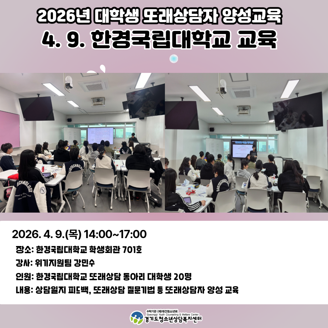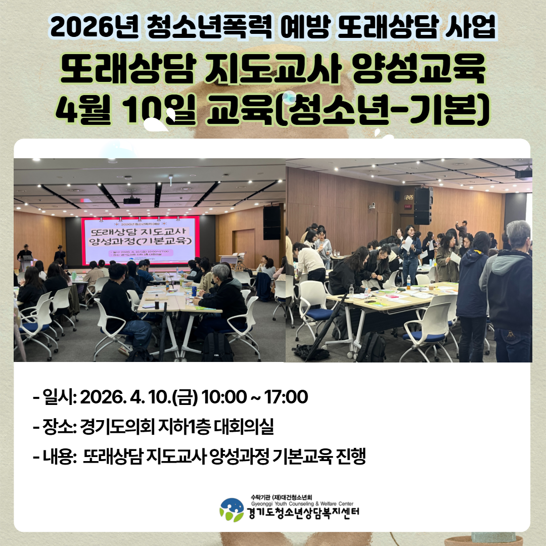 접수 : 2025.09.10 ~ 2025.09.24대상 : 경기도 내 청소년상담복지센터 종사자 -